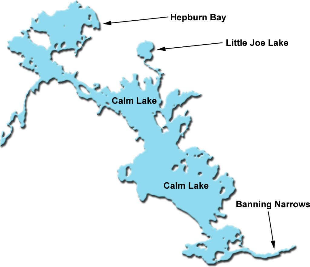 The large hydroelectric dam on the west end of Calm in Hepburn Bay has been in place since the 1920's and created a flood zone on the system, and Calm Lake is where it is most obvious.