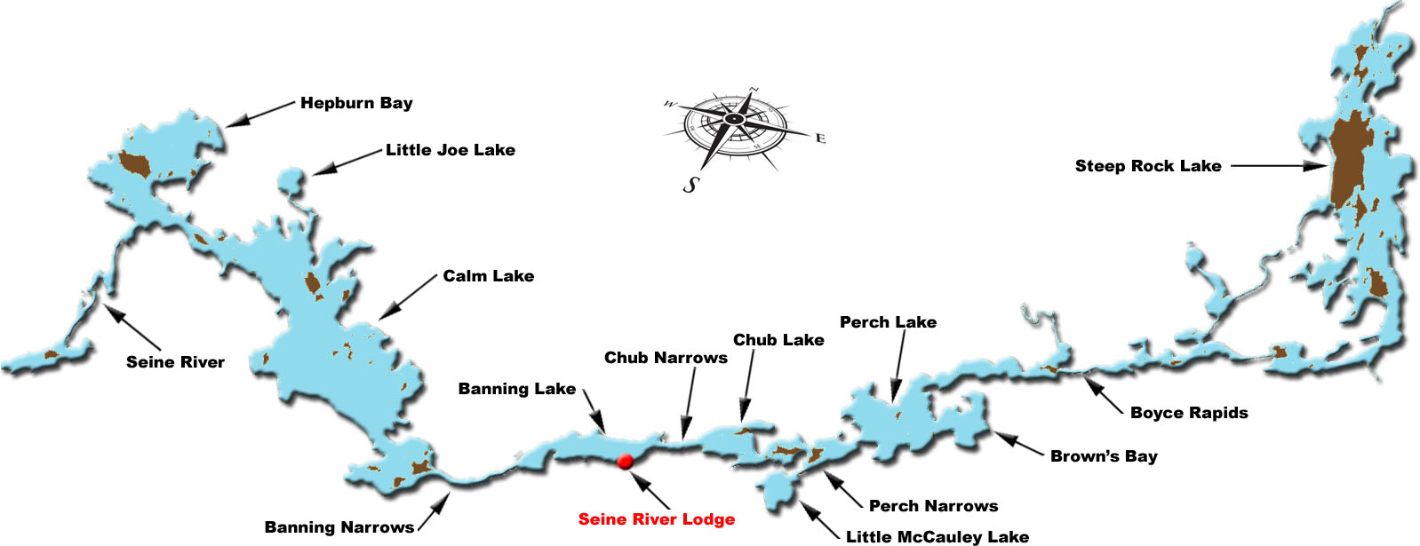 This is a map of the Seine Chain of Lakes from Steep Rock Lake (east) to the Seine River down stream from Calm Lake (west).